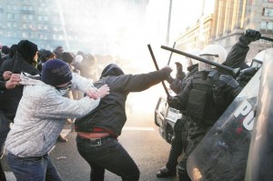 Nagle od czoła pochodu rozlegają się strzały, kilkaset metrów przed nami wzrasta natężenie okrzyków, pojawia się tam dym, czujemy nieznany zapach i jakieś opary. Od czoła pochodu z megafonów słychać słowa organizatorów o policyjnej prowokacji, padają na przemian z wezwaniami policji do rozejścia się i zapewnieniami że dziennikarzom i osobom którym przysługuje immunitet nic nie grozi, jeżeli wylegitymują się funkcjonariuszom. Policja informuje o użyciu gazu i broni gładkolufowej.