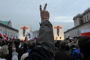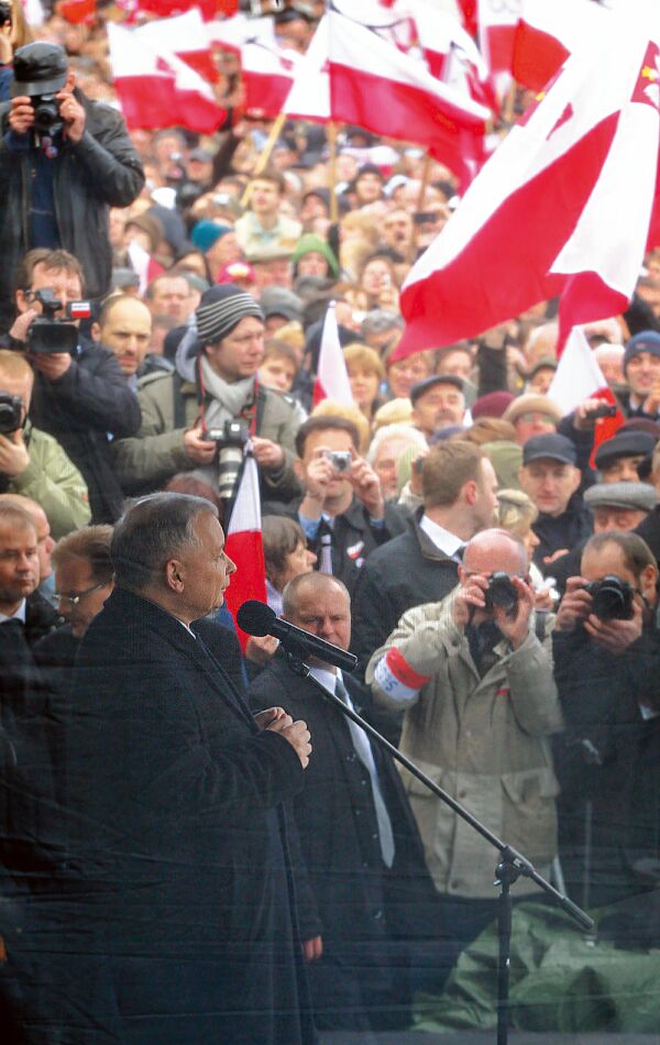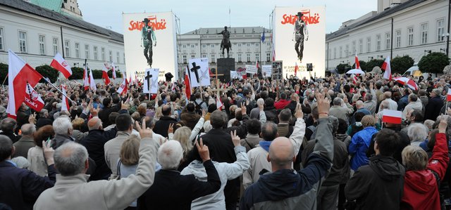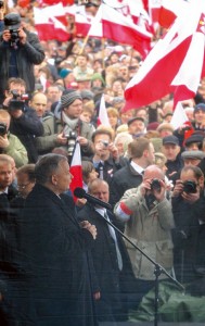 Kilkanaście tysięcy ludzi trzymających w rękach powiewające na wietrze biało-czerwone flagi odgrodzonych od dziedzińca Pałacu Prezydenckiego w Warszawie żelaznymi barierkami i kordonem straży miejskiej