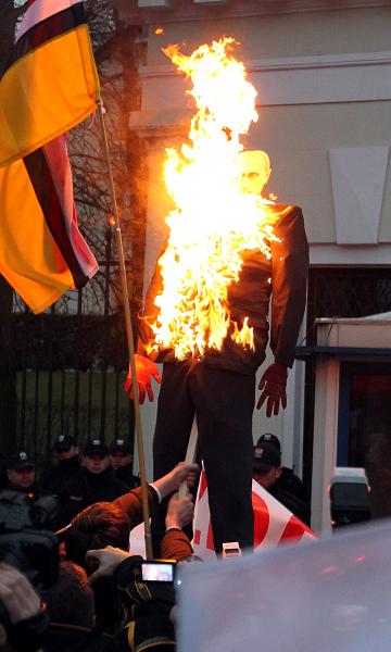 Pod koniec demonstracji pod ambasadą spalono kukłę Władimira Putina, skandując przy tym: ‘Morderca!’.