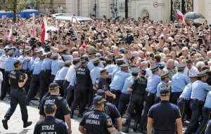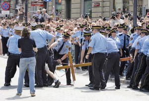 Ludzi przybywało dosłownie z minuty na minutę. Tłum wokół Pałacu Prezydenckiego gęstniał z godziny na godzinę. Tuż przed godz. 13 przestrzeń naprzeciw pałacowego dziedzińca wypełniona była nadzwyczaj szczelnie. ‘Tu jest Polska, a nie Moskwa’, ‘Judasze’, ‘Czerwona mafia’, ‘Hańba’ – skandowali zgromadzeni pod adresem przygotowujących się do demontażu krzyża służb. W pewnej chwili napór na barierki był tak silny, że ustawionym wzdłuż nich funkcjonariuszom straży miejskiej z trudem udało się opanować sytuację. Użyli gazu łzawiącego.