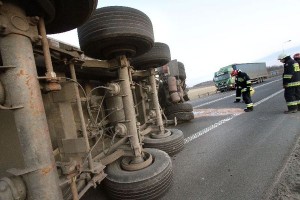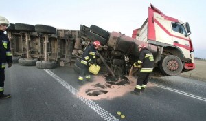 Samochód ciężarowy leżał na boku blokując na kilka godzin drogę. Na miejsce zadysponowano trzy pojazdy ratowniczo-gaśnicze z Państwowej i Ochotniczej Straży Pożarnej. Akcja trwała 5 godzin i 49 minut.
