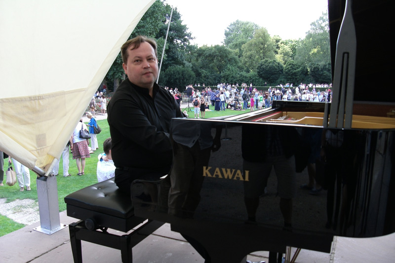 Znakomitą formę zaprezentował 28 lipca Filip Wojciechowski, który musiał się też zmagać ze straszliwym upałem. Słońce paliło tak ostro że pot lał się z niego strumieniami, a palce przyklejały do klawiatury… Filip Wojciechowski to wciąż jeszcze młody pianista /ma 43 lata/, a już cieszący się zasłużonym uznaniem. Ma na koncie mnóstwo nagród i wyróżnień. Jest założycielem i liderem cenionego tria jazzowego. Prywatnie mężem również znanej i cenionej pianistki Justyny Galant, z którą wspólnie koncertuje.