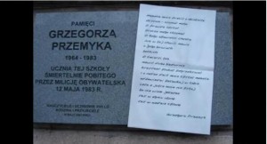 Tablicę upamiętniającą syna opozycyjnej poetki, maturzystę Grzegorza Przemyka, zmarłego 14 maja 1983 r. w wyniku pobicia przez komunistycznych milicjantów na komisariacie na warszawskim Starym Mieście, odsłonięto na murze kamienicy gdzie znajdowała się wówczas siedziba Milicji Obywatelskiej