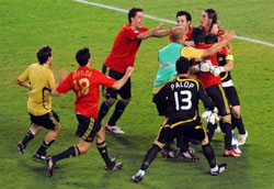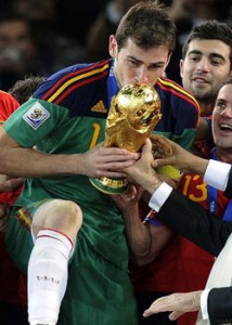 Aktualni mistrzowie Europy – Hiszpanie – zostali w RPA mistrzami świata w piłce nożnej. To pierwszy tytuł w historii mundiali dla tego kraju. Hiszpanie wygrali finał po nadspodziewanie zażartej walce z Holendrami, strzelając zwycięską bramkę dopiero w ostatnich minutach dogrywki. Zrobił to niezawodny Iniesta, wyręczając nieskutecznych napastników. Do 90 minuty meczu było 0:0. W zespole nowych mistrzów świata poza Iniestą rewelacyjnie zagrali Xavi, Ramos, Puyol i może przede wszystkim bramkarz Casillas. Finałową rywalizację bardzo dobrze poprowadził znany sędzia z Anglii – Howard Webb.
